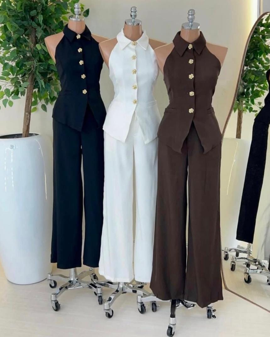 Apresentamos o conjunto elegante alfaiataria, perfeito para quem busca sofisticação e conforto em uma única peça. Confeccionado em tecido leve e de excelente caimento, este conjunto é composto por uma blusa sem mangas com botões dourados e calça de corte reto, que proporciona um look alinhado e moderno para diversas ocasiões. Ideal para ambientes de trabalho, eventos sociais ou encontros especiais, seu design garante beleza e praticidade.